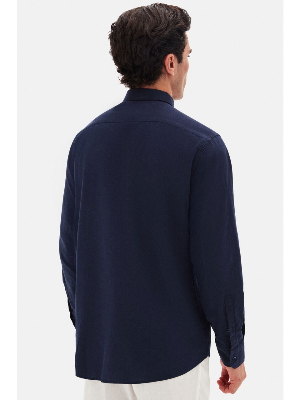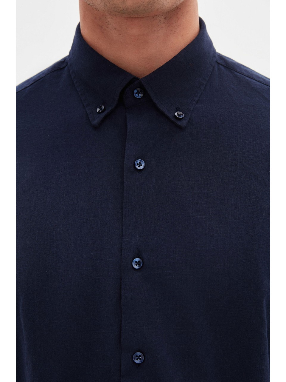 Lacivert Düğmeli Yaka Rahat Kesim Keten Görünümlü Pamuk Gömlek