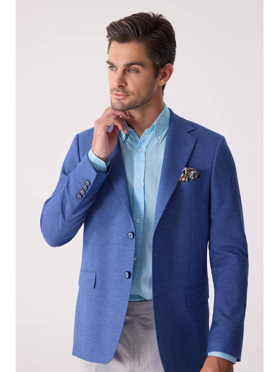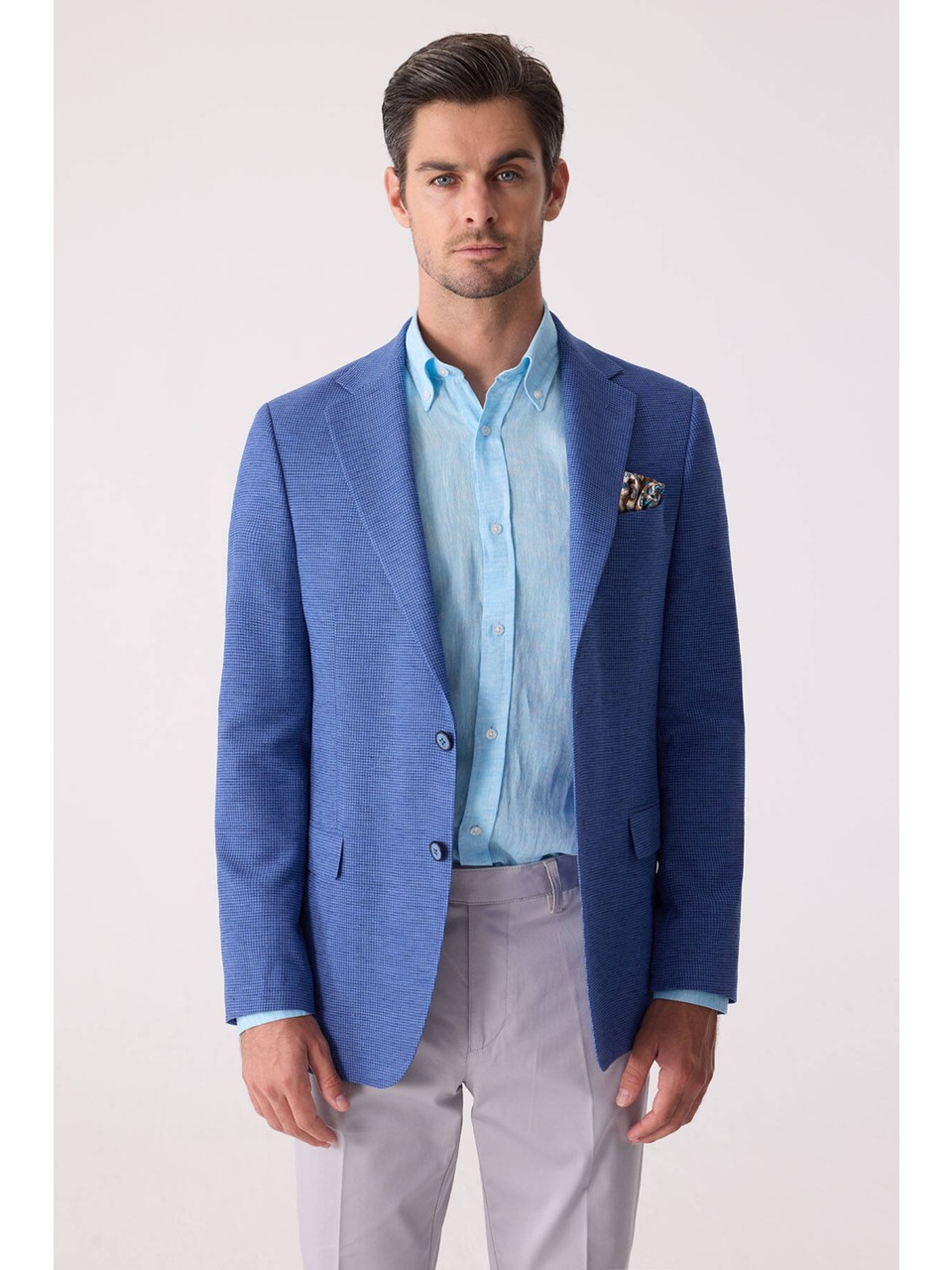 Erkek Mavi Regular Fit Keten Karışımlı Mono Yaka Ceket