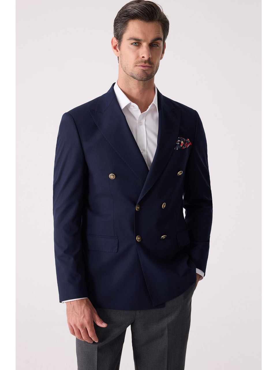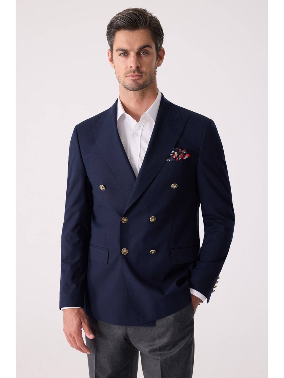Erkek Lacivert Regular Fit Yün Puntolu Kruvaze Blazer Ceket